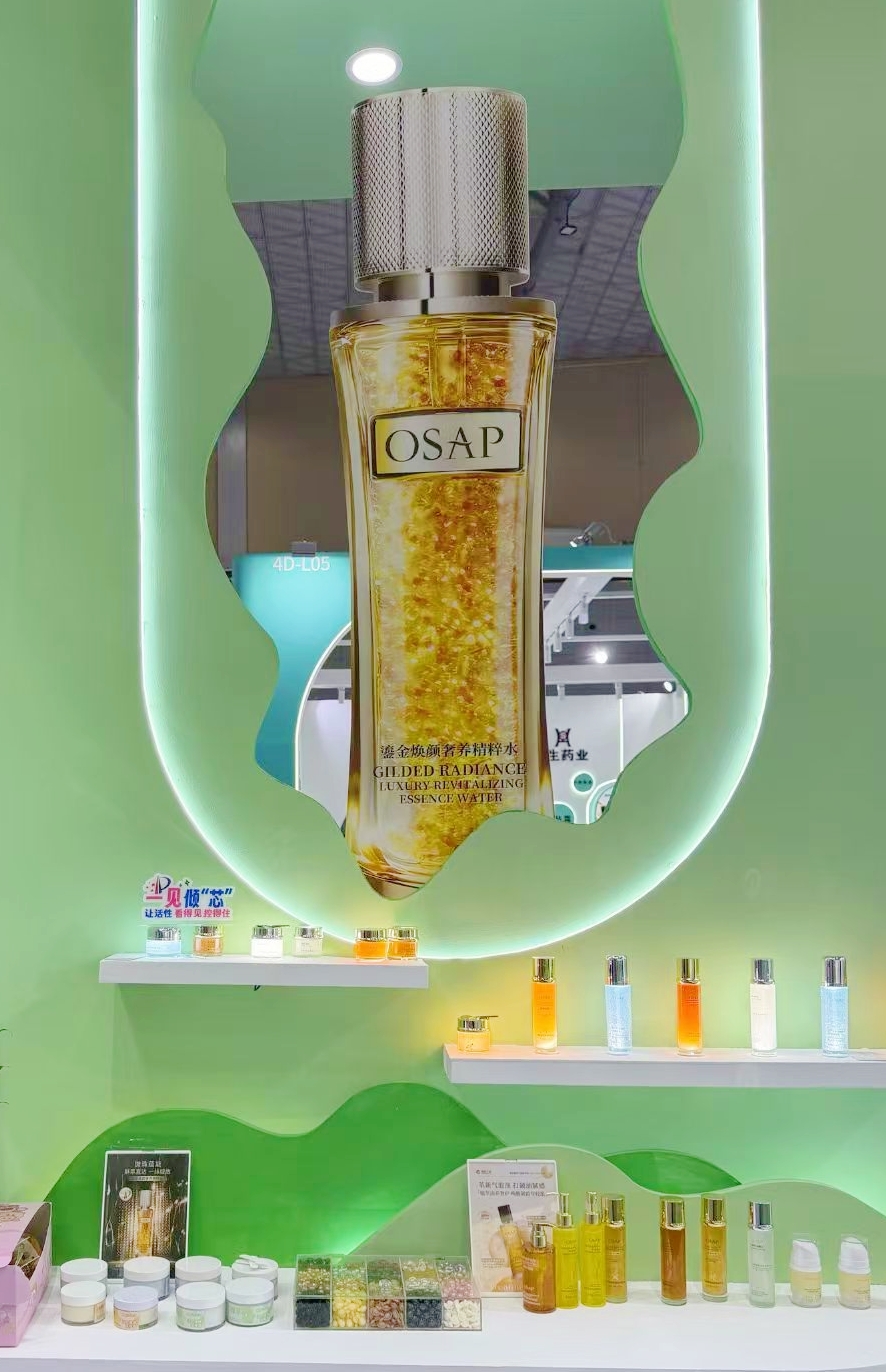 煜明重磅推出的自研微珠系列成为本次展会的"人气王"。采用专利微流控锁鲜技术,将高活性精华封存于颗颗微珠中,触肤瞬间鲜活释放,功效倍增。